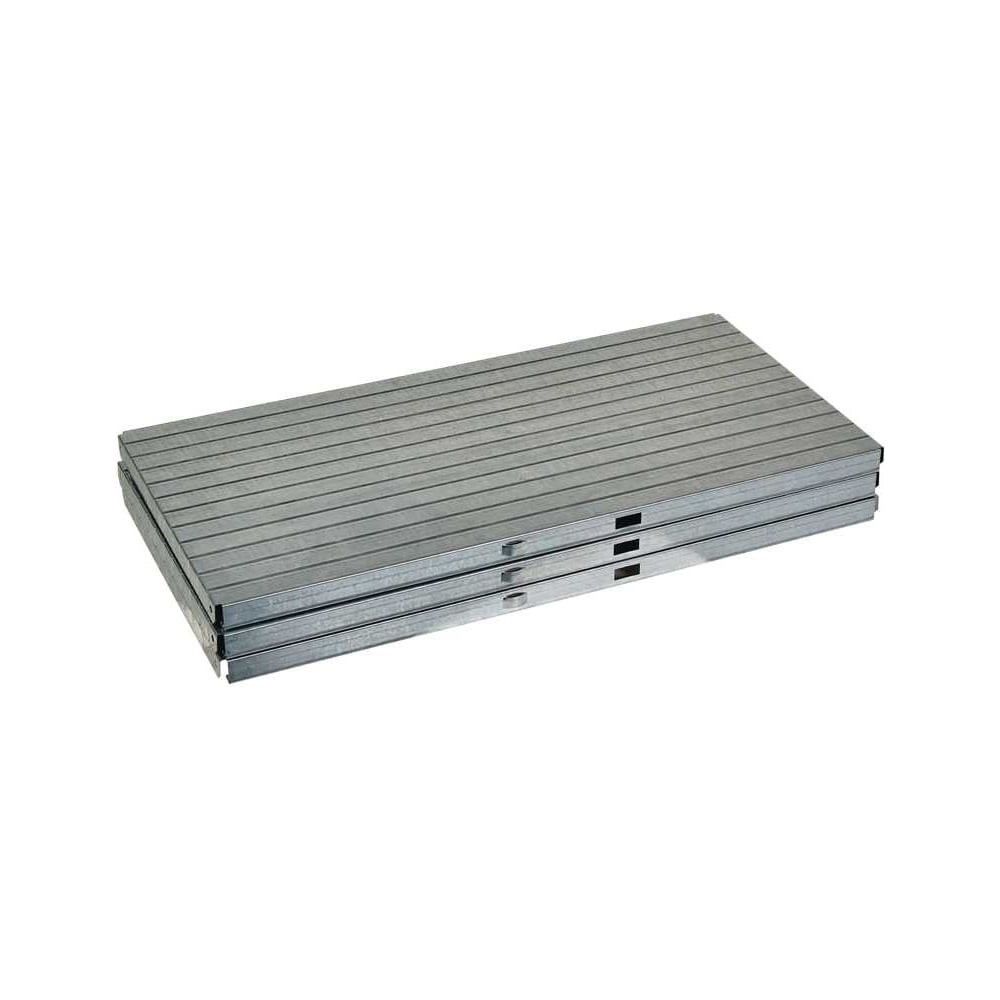 Настил на каркас полки 90 см (3полки) это металлические полки, которыми застилают уровни хранения. Подходят для покрытия одной полки Стеллажной системе 180х90х60 см и Дополнительной секции 180х90х60 см. В комплекте 3 полки размером 30Х60 см для покрытия одного уровня 900 мм. Панели изготовлены из прочного металла и надежно защищены от появления ржавчины оцинкованным покрытием. Габариты одной полочки: ширина 30 см, длина 60 см, высота 2,3 см.На один комплект стеллажа 90 см - 3 упаковки настила при учете, что на стеллаже 3 уровня хранения (без доп. уровней). Удобно приобретать настил при добавлении дополнительного уровня или когда настил необходим не на все полки стеллажной системы.