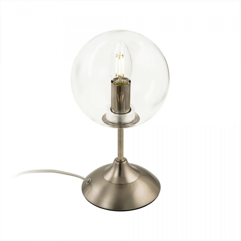 Настольная лампа CL102811 с одним плафоном. Корпус модели изготовлен из металла, цвет хром. Плафон стеклянный в форме шара, прозрачный. Сетевой провод прозрачный длиной 1,7 метра, на нем расположен выключатель на расстоянии 20 см от основания. В этом настольном светильнике используется лампа в форме свечи с цоколем Е14, максимальная мощность лампы накаливания 40 Вт. Площадь освещения около 2,5 метров. Светодиодные лампы можно использовать большей мощности. Однорожковая настольная лампа Томми CL102811 отлично подойдет для помещений, оформленных в современном стиле.