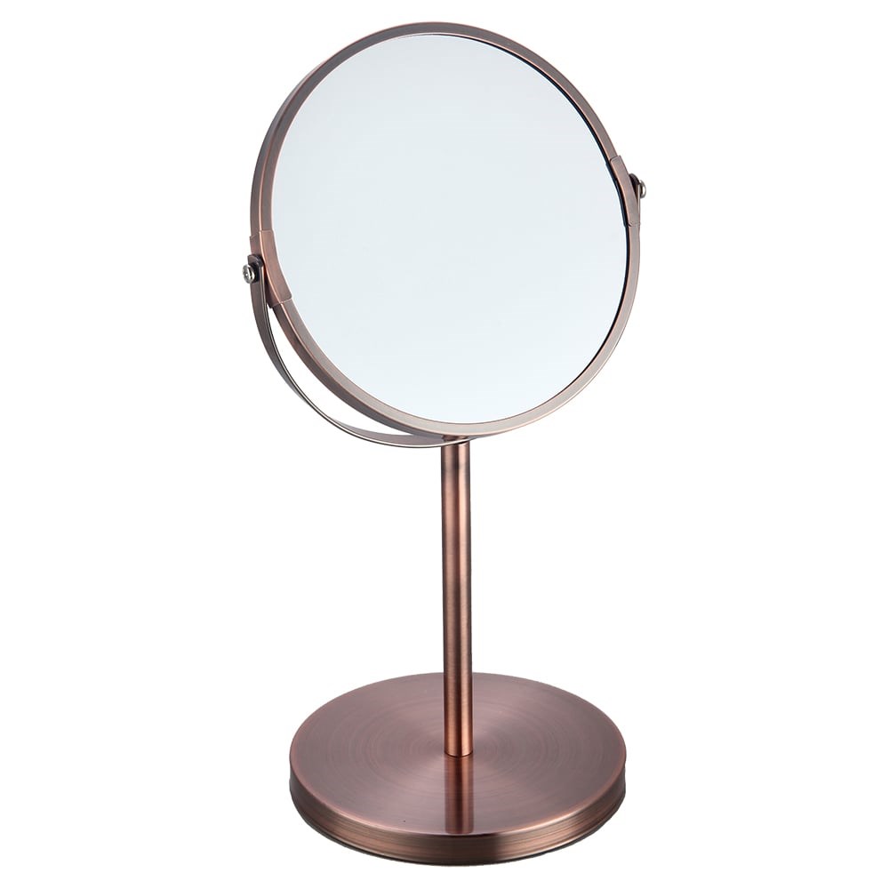 Поворачивается на 360 градусов. Сторона с двухкратным увеличением. Подставка и держатель зеркала прикручиваются болтами к стойке - ножке (165 мм), с внутренней стороны подставка имеет утяжелитель для устойчивости. Материал - стекло, сталь с матовым бронзированным покрытием.