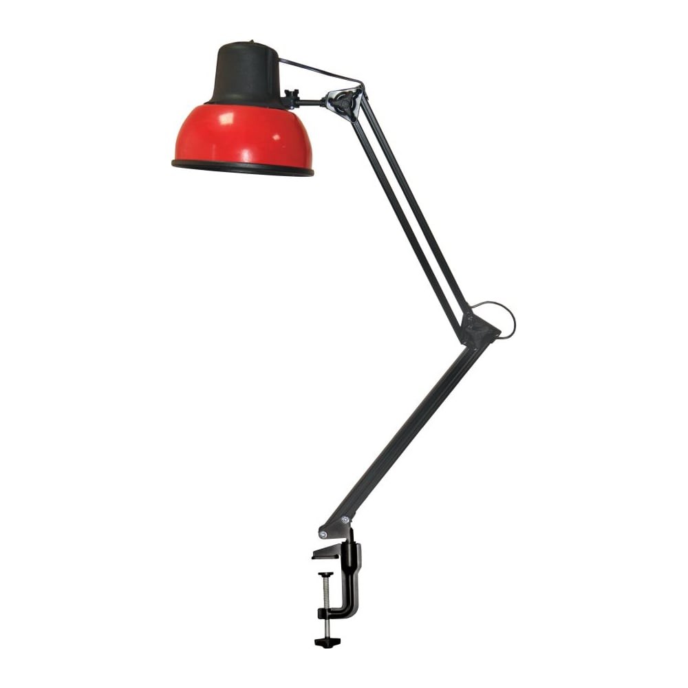 Светильник на Бета-К красного цвета на металлической струбцине, с цоколем Е27 (лампа в комплект не входит). Выключатель клавишный на плафоне. Подходит для использования в жилых помещениях и учебных заведениях, в офисах, а также в медицинских учреждениях, мастерских и пр. Подходит для интерьеров в стиле техно, лофт, минимализм и эклектика.