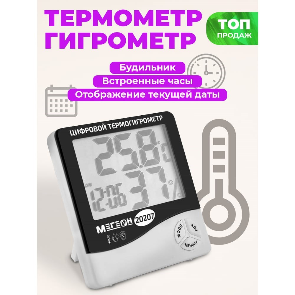 МЕГЕОН 20207 - это настольный прибор для измерения температуры и влажности воздуха в помещении, кроме этого в прибор встроены часы (работающие в 12 или 24 часовом формате), будильник и отображение текущей даты, сохраняет в памяти минимальную и максимальную зафиксированную температуру и влажность.Прибор оснащен большим высококонтрастным жидкокристаллическим дисплеем, на котором одновременно отображаются температура, влажность и текущее время, а использование современной элементной базы позволило достичь высокой точности измереных значений.Благодаря современному эргономичному дизайну термогигрометр идеально впишется в интерьер любого дома, а функция фиксации минимального/максимального значений температуры будет полезной при использовании прибора в загородных домах и складских помещениях.