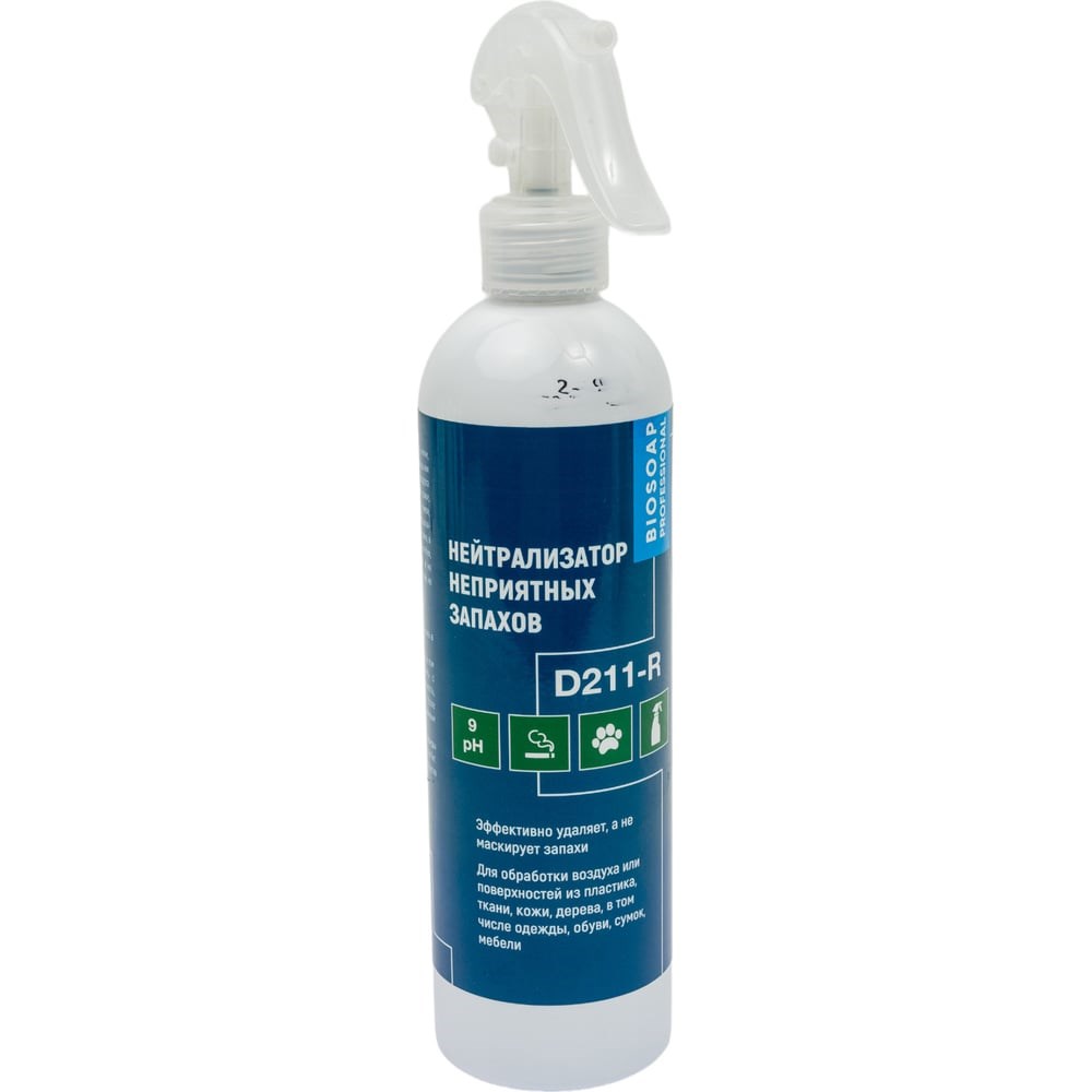 Нейтрализатор неприятных запахов АиС BIOSOAP Proffecional / D211-R 1 500 мл 9041355 подходит для обработки воздуха или поверхностей из пластика, ткани, кожи, дерева, в том числе одежды, обуви, сумок, мебели. Нейтрализует неприятные запахи пота, мочи, гнили, сырости, табака, копоти, домашних животных. Может применяется для нейтрализации неприятного запаха в квартире или доме, в офисе, в фитнес центрах, спортивных клубах, раздевалках, туалетах. Не повреждает и не разрушает поверхности, не оставляет пятен, не требует смывания.Применение:Для удаления запаха в воздухе: распылить в помещении.Для удаления запаха на поверхности (в том числе и обработка обуви): распылить с расстояния 10-15 см. на всю поверхность, источающую неприятный запах. После обработки дать высохнуть естественным путем.