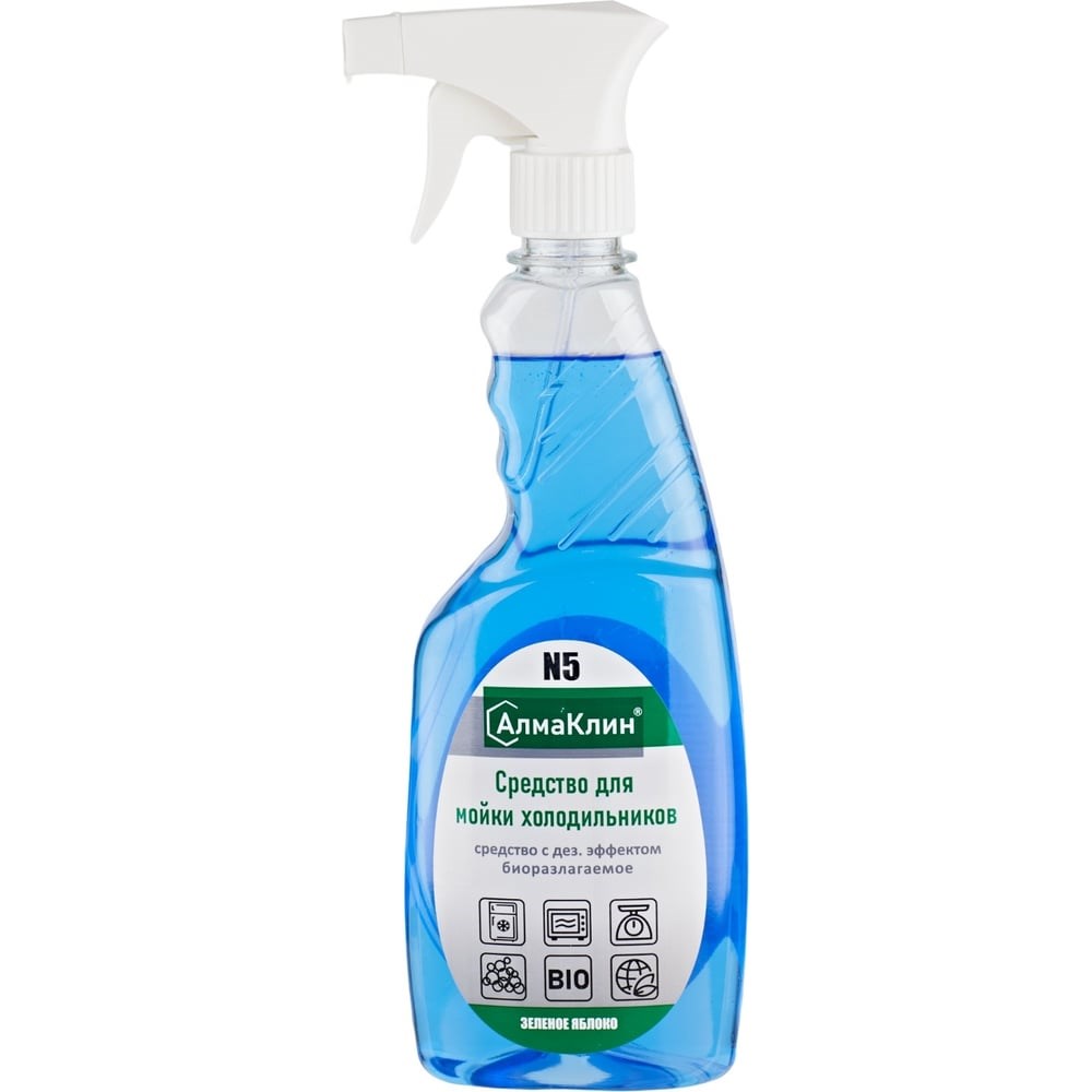 Нейтральное моющее средство для холодильников ООО "БАЗОВАЯ ДЕЗИНФЕКЦИЯ" АлмаКлин N5, 0.5 л, триггер N5-З/Я-0,5Л предназначено для мытья внутренних и внешних поверхностей холодильников, морозильных шкафов, авто холодильников, микроволновых печей, весов, слайсеров, упаковочного оборудования.Эффективно удаляет пищевые загрязнения, различные пятна со стенок и полок холодильника.Не оставляет разводов, устраняет неприятные запахи. С антибактериальным эффектом.
