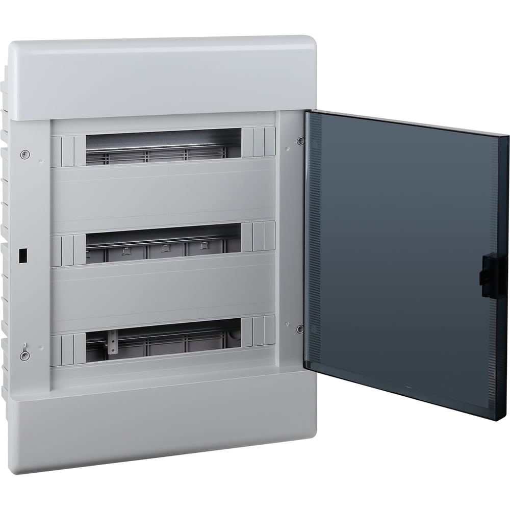 Щиток «ТУСО» под автоматические выключатели для скрытой проводки на 54 модуля (ЩРв-П IP41). Цвет серый, дверца тонированная.Предназначен для монтажа модульных компонентов и электрических счетчиков в жилых, производственных, складских, административных и торговых помещениях. Для удобства монтажа электротехнического оборудования рамка с DIN-рейками съемная.Стойки крепления для DIN-реек дают возможность монтажа модульного оборудования и приборов учета на разную глубину путем перемещения DIN-рейки в тот или иной паз.Расстояние между центрами DIN-реек составляет 150 мм.