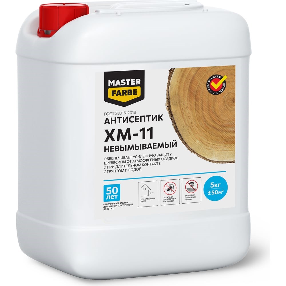 Невымываемый антисептик для защиты древесины в тяжёлых условиях эксплуатации MASTERFARBE ХМ-11 5 кг 4631159427293 используется для защиты деревянных строительных конструкций от биологического разрушения (гниения, поражения насекомыми древоточцами) в тяжёлых условиях эксплуатации при контакте с грунтом и водой: причалы, заборные столбы, сваи, основания теплиц, ограждения грядок.Преимущества:Химически связывается с древесинойОкрашивает древесину в зеленоватые тонаНе создает поверхностной пленки и не нарушает воздухообменСохраняет свойства и структуру древесиныНе имеет запахаЯвляется малоопасным веществом (IV класс опасности), не горюч и взрывобезопасенПосле высыхания антисептик безопасен для людей и животных