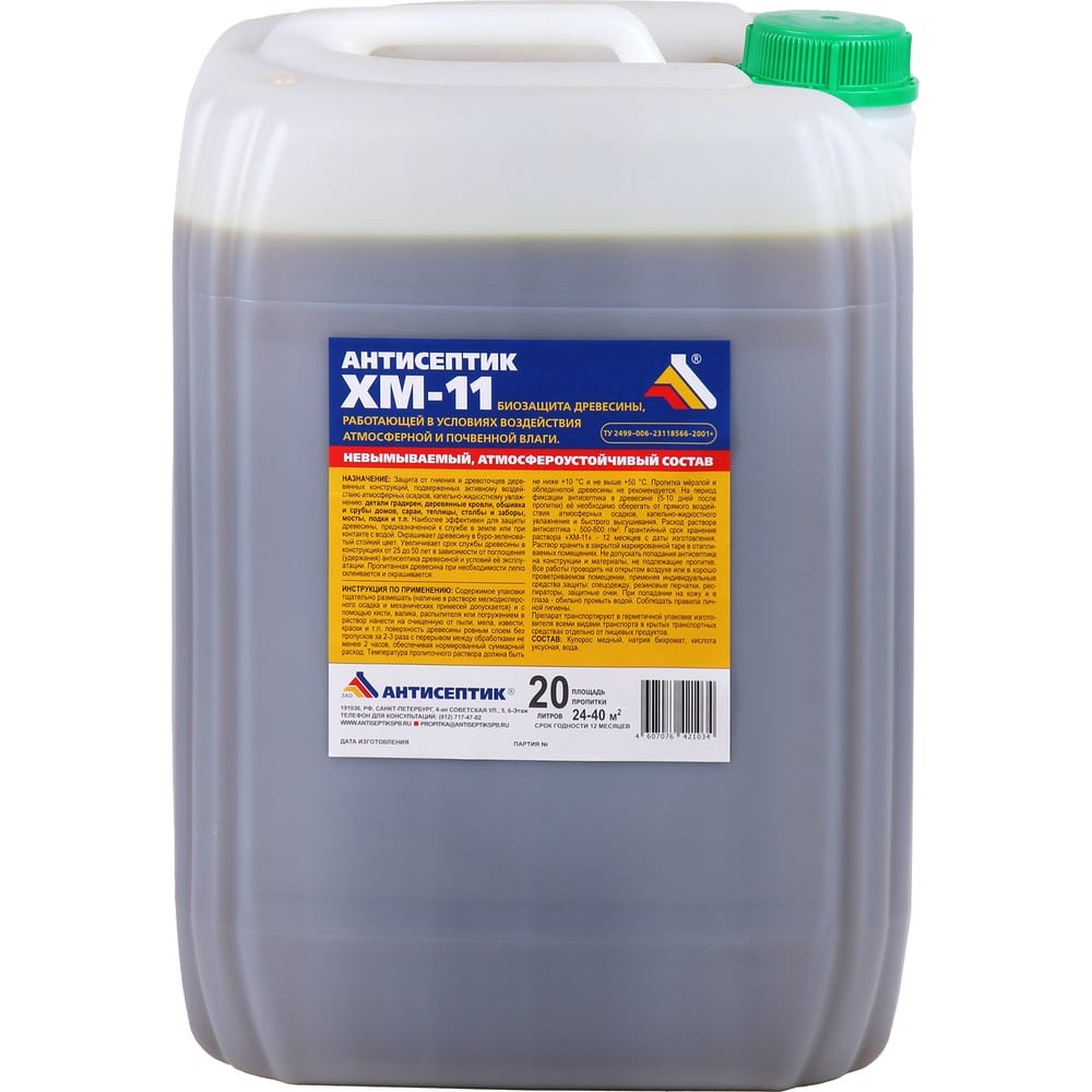 Невымываемый антисептик ЗАО "Антисептик" ХМ-11 20 л 00-00003715 предназначен для эффективной защиты деревянных строительных конструкций от биологического разрушения (гниения, поражения древоточцами). Состав применяется для древесины в условиях ее непосредственного контакта с грунтом и водой (сваи, деревянные детали опор линий связи и электропередач, заборные и дорожные столбы, шпалы, лаги утопленные в грунт, настилы мостов, рудничные стойки, деревянные кровли, деревянные контейнеры, обшивка срубов, фронтонов, деревянные элементы теплиц).