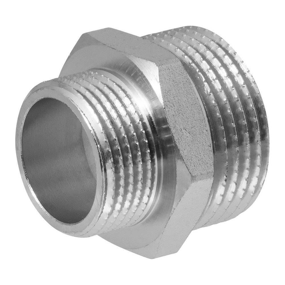 Ниппель-переходник сантехнический 1" на ¾" н/н латунный MPF ИС.072175, также называемый переходным бочонком 1"–¾", предназначен для соединения элементов трубопроводов в системах холодного и горячего водоснабжения, а также отопления. Фитинг имеет форму цилиндра с двумя наружными резьбами разного диаметра. Для обеспечения герметичного соединения при монтаже рекомендуется использовать сантехнический лен с пастой и/или тефлоновую ленту (лента ФУМ) и/или аэробный герметик.Ниппель-переходник 1" на ¾" изготовлен методом горячей объемной штамповки (ГОШ). Изделие выполнено из высококачественной латуни CW617N и имеет никелированное покрытие толщиной не менее 7 мкм, что обеспечивает устойчивость к коррозии и допускает применение в системах питьевого водоснабжения благодаря пониженному содержанию свинца в сплаве. Для удобства монтажа каждый фитинг оснащен участком шестигранной формы под гаечный и/или разводной ключ.Соединение является разъемным, что позволяет при необходимости обслуживать участок трубопровода, а также повторно использовать резьбовой переходник. Вся линейка фитингов MPF прошла испытания по ГОСТ Р 51372-99 «Методы ускоренных испытаний на долговечность и сохраняемость» в испытательной лаборатории ВНИИЦИ. По результатам испытаний подтвержден предполагаемый срок службы фитингов без проявления признаков коррозии не менее 25 лет.