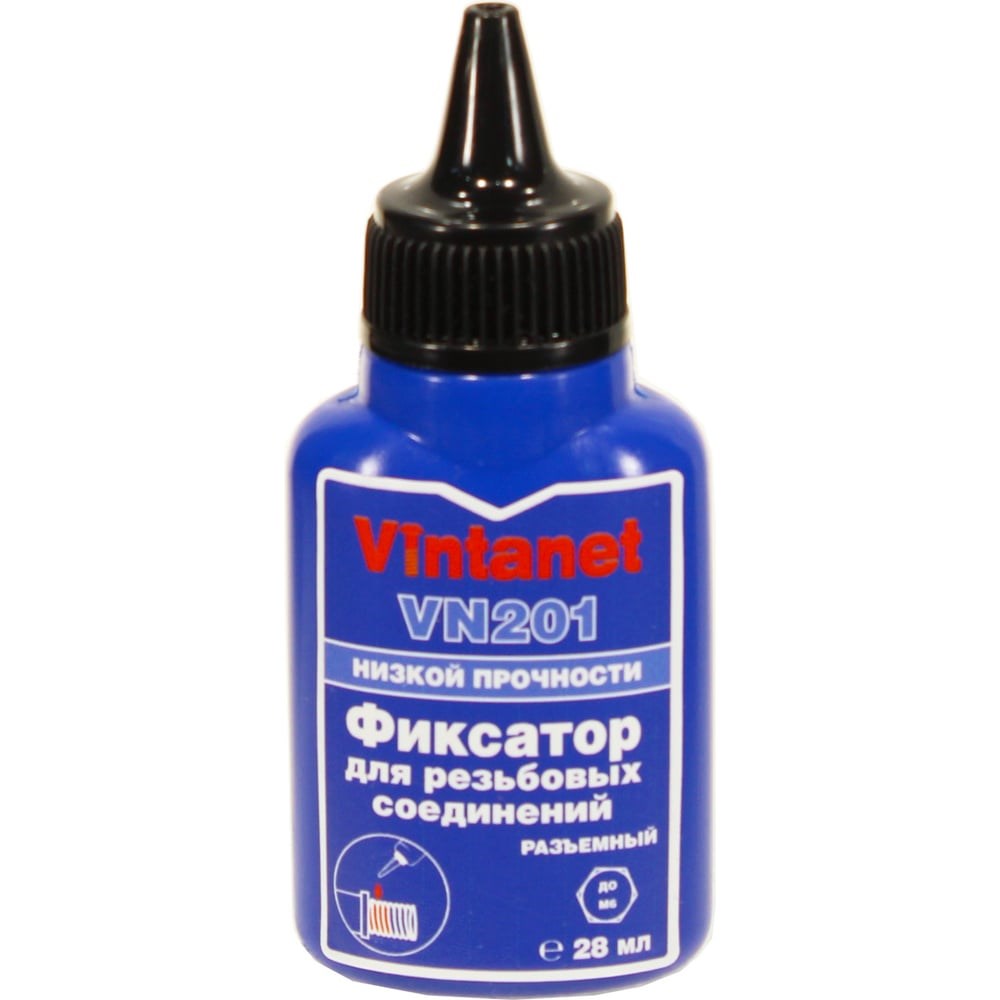 Фиксатор для резьбовых соединений, низкопрочный, анаэробный VINTANET VN201, 28 мл VN20128ML - фиксатор низкой прочности, средней вязкости для резьбовых соединений с зазорами до 0,15мм, анаэробный, отверждающийся при нарушении контакта с воздухом с образованием полимерного слоя. Для нанесения на любые металлы, включая пассивные основания, такие как нержавеющая сталь, алюминий и поверхности с гальваническим покрытием. Продукт обладает коротким временем фиксации на стали, латуни и нержавеющей стали - 10, 15 и 20 мин соответственно. Демонстрирует высокую устойчивость к незначительному загрязнению промышленными маслами (например, моторными, антикоррозионными маслами), а также смазочно-охлаждающими жидкостями.