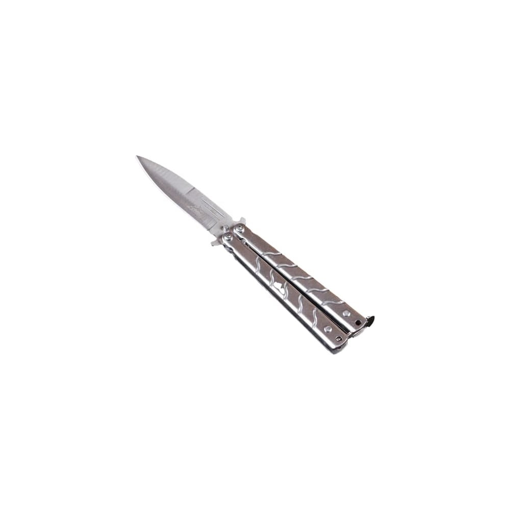 Нож-бабочка Мастер К темный хром, лезвие 7.7 см, рукоять с полосами 2461184 подходит для использования в туристических поездках, походах, на рыбалке и охоте. Лезвие изготовлено из прочной хромированной стали, что обеспечивает долгий срок службы. Безопасное хранение. Рукояти оснащены защелкой, которая предотвращает их случайное раскладывание.