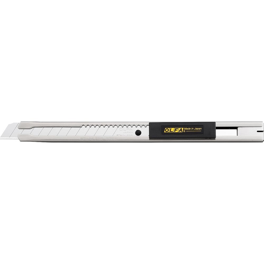 Нож OLFA 9 мм OL-SVR-2 оснащен съемной клипсой для отламывания затупившихся сегментов лезвия, а также для крепления инструмента на карман. Корпус и лезвие данного ножа изготовлены из нержавеющей стали. Предусмотрен автоматический механизм фиксации лезвия.
