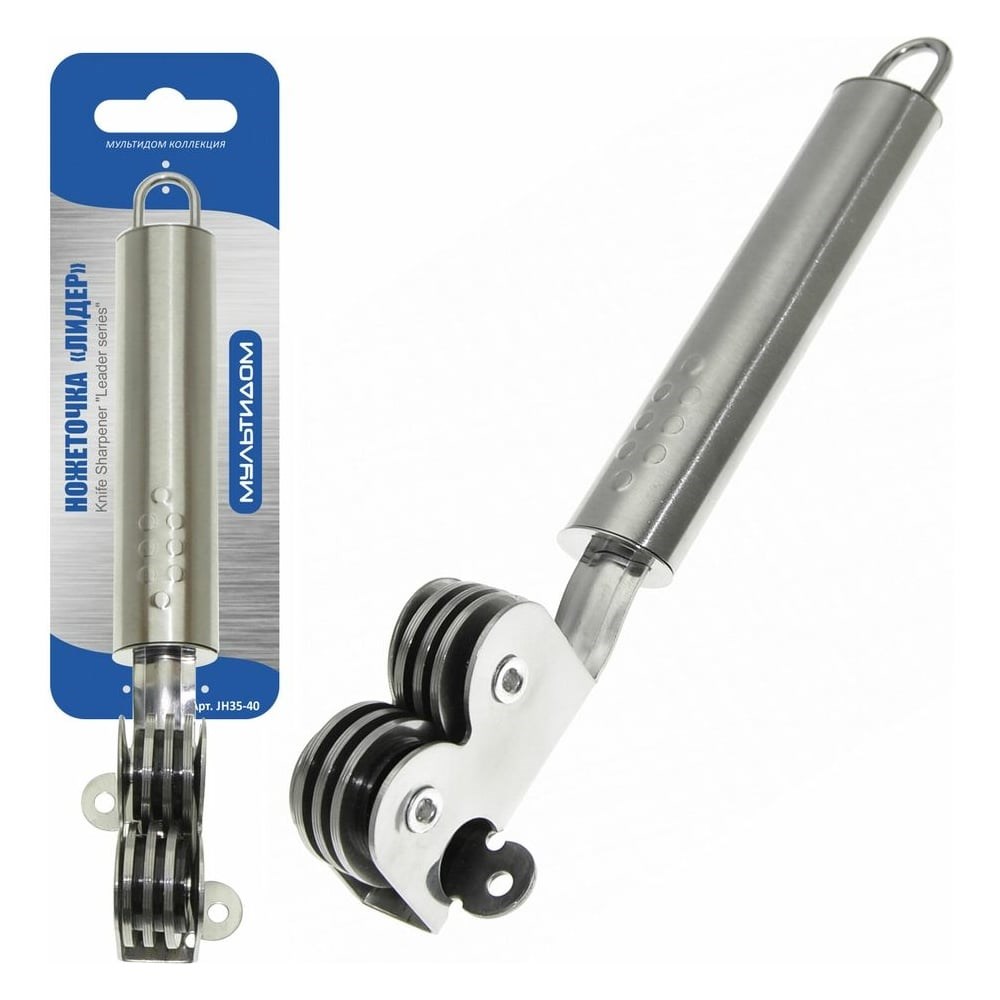 Ножеточка МУЛЬТИДОМ Лидер нержавеющая сталь JH35-40 предназначена для заточки ножей и ножниц.Благодаря компактным размерам не занимает много места.Обеспечивает безопасную заточку, поэтому практична в использовании.За счет эргономичной формы ножеточка удобно лежит в руке.