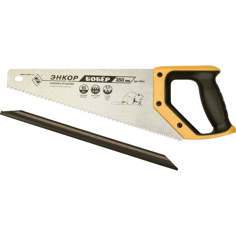 Ножовка Энкор Бобер 9854 предназначена для выполнения продольного и поперечного распила заготовок из древесины. Полотно длиной 350 мм изготовлено из стали 65 Mn. Пластиковая рукоятка частично обрезинена, что обеспечивает хороший захват и контроль инструмента при работе.