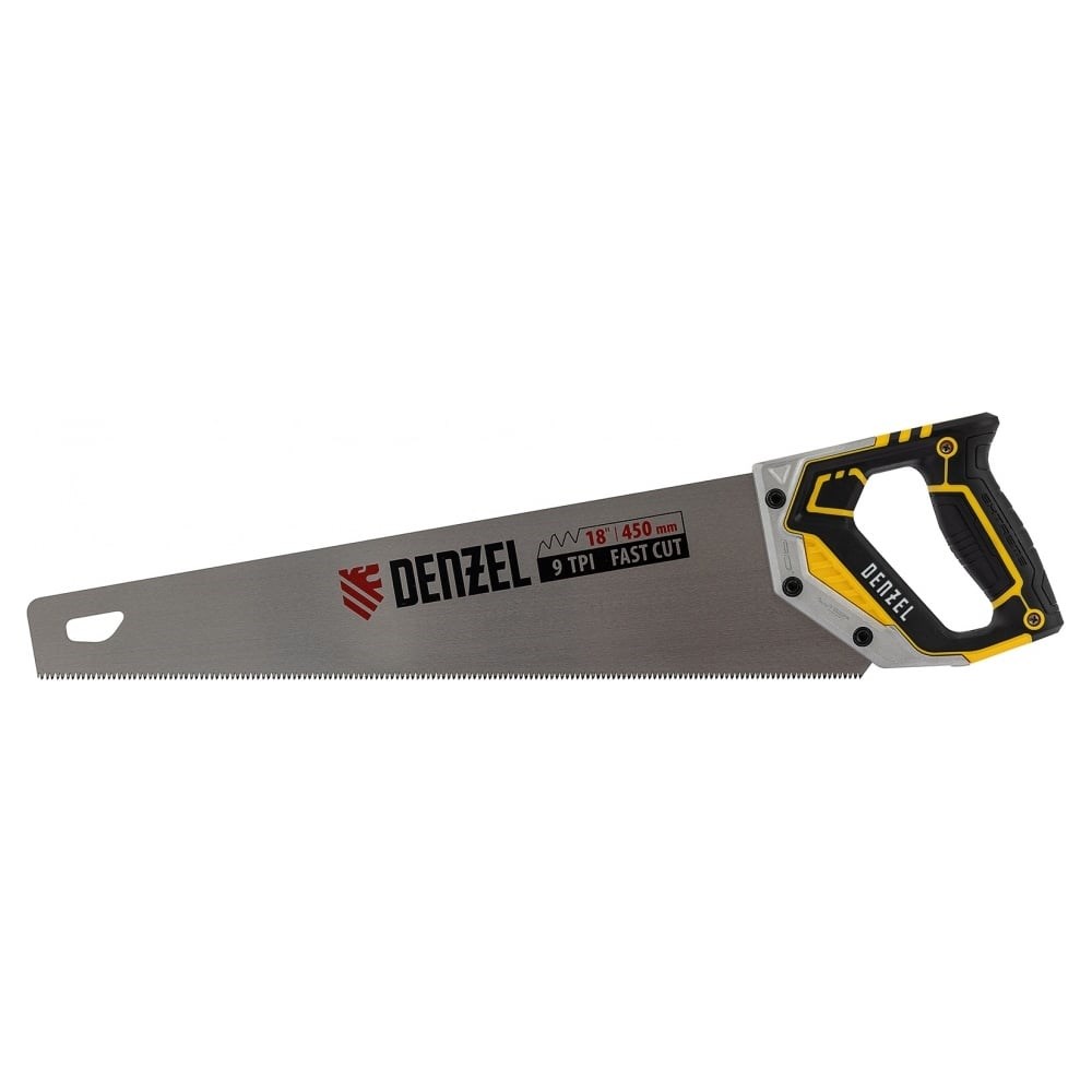 Ножовка по дереву Denzel, 450 мм, 9 TPI, зуб 3D, металлопластиковая рукоятка 24140 предназначена для столярных работ- распиловка заготовок из древесины, ДСП и OSB. Может производить продольный и поперечный распил. Ножовка обладает высокой производительностью благодаря агрессивной трехгранной, многоступенчатой заточке зубьев, которая обеспечивает идеальную геометрию и высокую остроту зуба. Пильное полотно изготовленное из японской стали SK-5. Закалка ТВЧ обеспечивает дополнительную твердость зуба 55-58 HRC. Благодаря эргономичной форме и рифленой поверхности, металлопластиковая обрезиненная рукоятка удобно ложится в руку и не скользит, обеспечивая комфорт во время интенсивной работы.