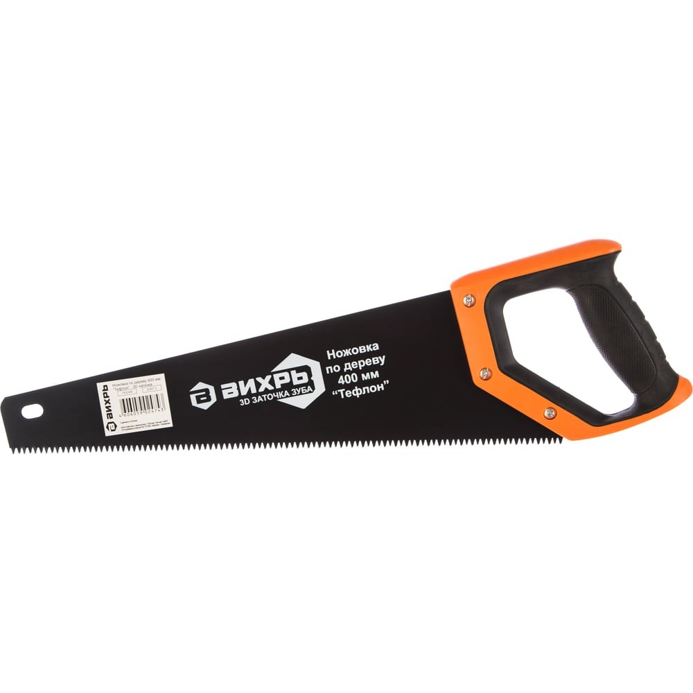 Ножовка ВИХРЬ 400 мм "Тефлон" с трехмерной заточкой и двухкомпонентной рукояткой применяется для продольного и поперечного пиления. Покрытие рабочей части лезвия тефлоновое. С помощью двухкомпонентной рукоятки обеспечивается надежный хват, и при длительной работе не натирает руки. Особенности: Ножовка изготовлена из углеродистой стали с твердостью закаленного зуба 46–52 HRС. Трехгранная заточка зубьев обеспечивает плавность пиления и максимальную производительность. Отверстие в полотне для удобного хранения (подвеса).