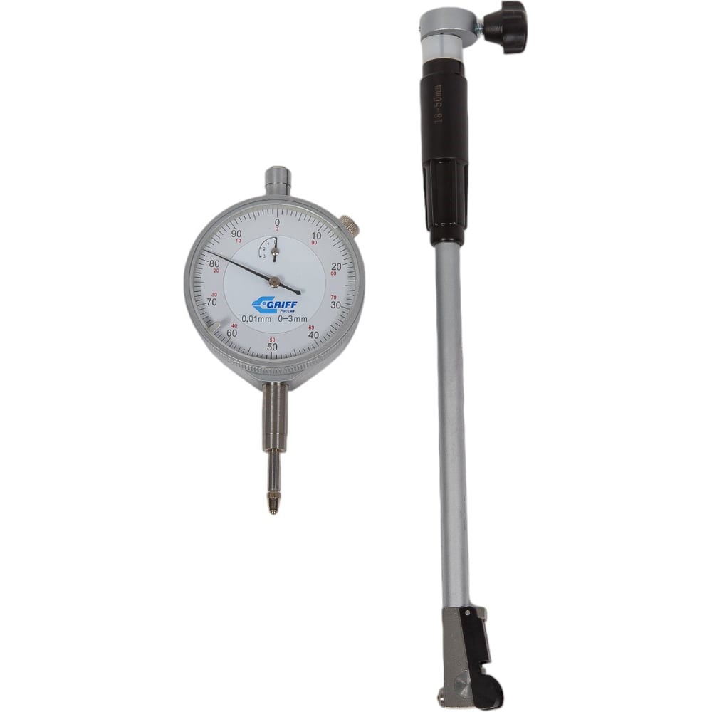 Нутромер GRIFF НИ 18-50 ГОСТ 868-82 пр-во Guilin Measuring D128017 используется при проведении измерений внутренних габаритов изделия. Инструмент оснащен индикатором часового типа. Максимальная глубина измерения составляет 150 мм. Измерения проводятся двухточечным контактом.
