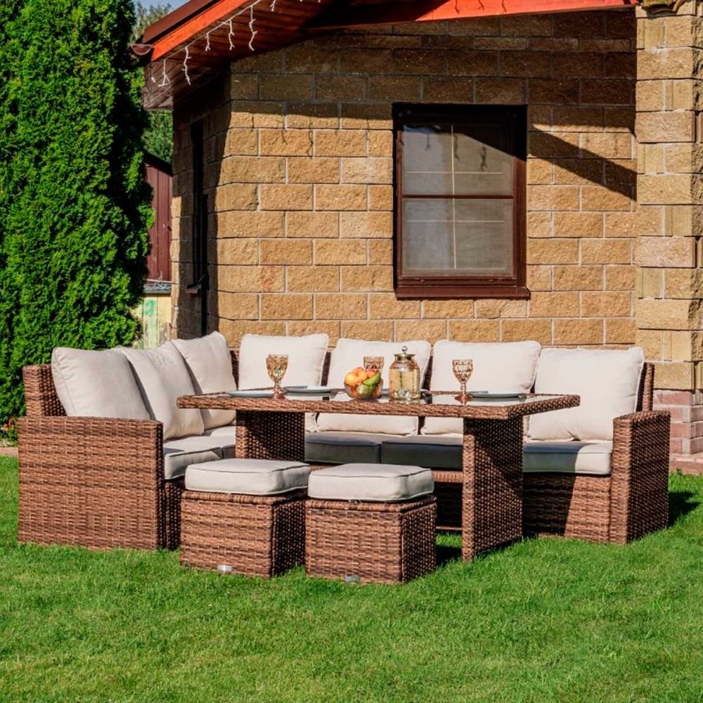 Выполненный в коричневом оттенке комплект уличной мебели ZORRO – это все, что необходимо для полноценного досуга на территории приусадебного участка в теплое время года. Он отлично подойдет как любителям тихих семейных трапез, так и тем, кто предпочитает веселое времяпровождение в кругу близких людей. В состав набора входят: - вместительный угловой диван, состоящий из двух частей; - два пуфа с мягкими подушками-сидениями; - обеденный стол со столешницей из закаленного стекла прямоугольной формы; Комплект обеспечивает возможность комфортного размещения компании из 5-8 человек, а размеров стола вполне достаточно для расстановки всех любимых блюд и напитков.Садовая мебель ZORRO выполнена с декоративной отделкой из искусственного ротанга, плетение которого осуществлено ручным способом. Благодаря сочетанию мягких коричневых оттенков набор отлично вписывается в любое открытое пространство.Использование прочного металлического каркаса, в совокупности с вышеперечисленными материалами, обеспечивает эту уличную мебель рядом важных эксплуатационных преимуществ. Среди них:способность выдерживать высокие весовые нагрузки без риска деформации;устойчивость к воздействию механического толка;незначительный вес для легкой переноски;чехлы для подушек из водоотталкивающей ткани.Кроме того, мебель ZORRO не выгорает под влиянием прямых солнечных лучей, а также не теряет своих качеств в случае частых контактов с осадками.
