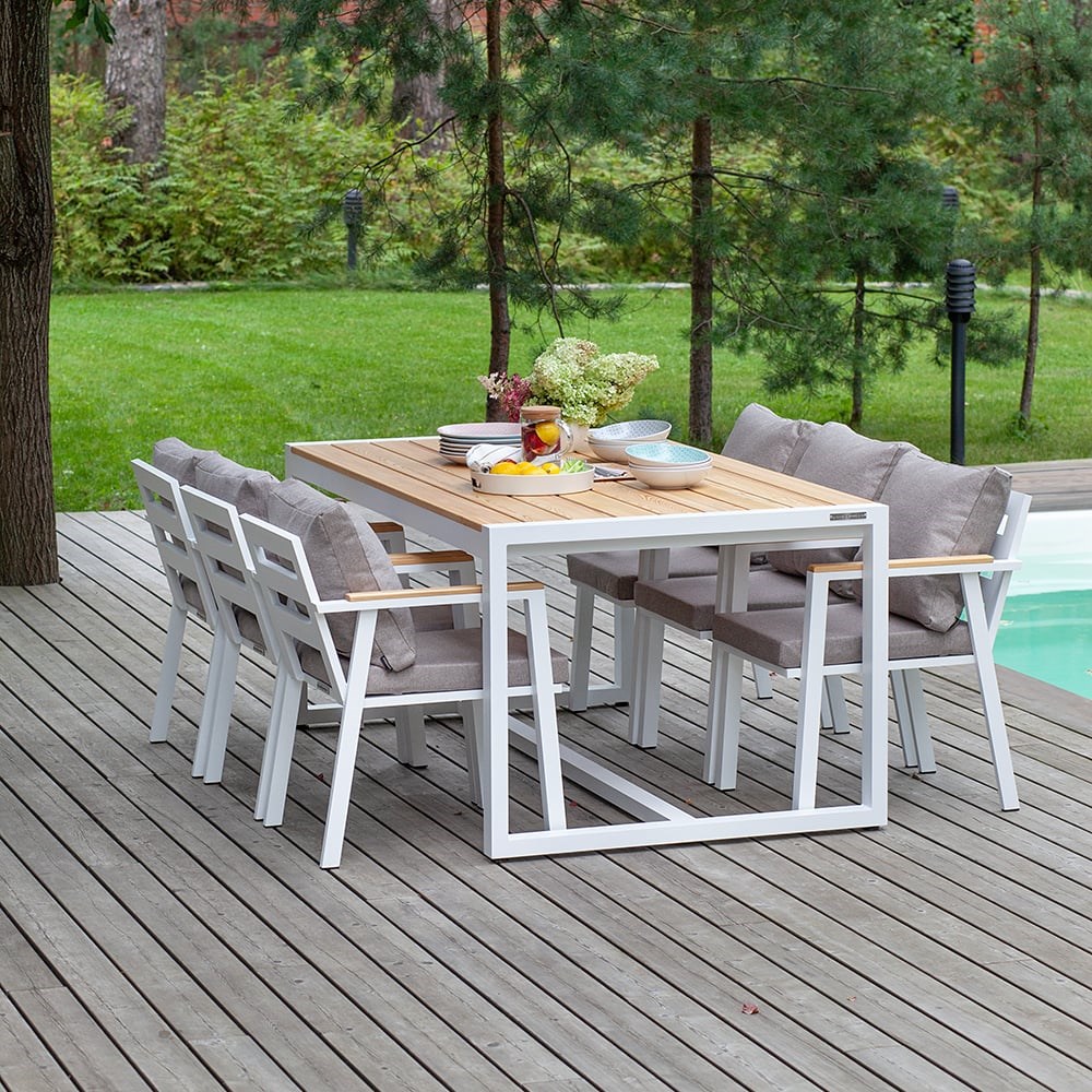 Комплект обеденной мебели SANTORINI создает уютную зону для отдыха и приема гостей в саду, на террасе коттеджа. В наборе на 6 персон представлены большой обеденный стол и 6 удобных стульев. Каркас мебели изготовлен из высокопрочного алюминия с полимерным покрытием белого цвета, столешница стола и подлокотники выполнены из массива лиственницы. Для комфортной посадки в комплекте идут мягкие подушки в съемных чехлах из мебельной рогожки пепельно-коричневого оттенка. Алюминиевая мебель отличается долгим сроком службы, подходит для улицы и помещений. Обеденная группа органично впишется в интерьер загородного дома, клуба, ресторана, отеля. Набор садовой мебели доставляем в собранном виде в надежной упаковке.