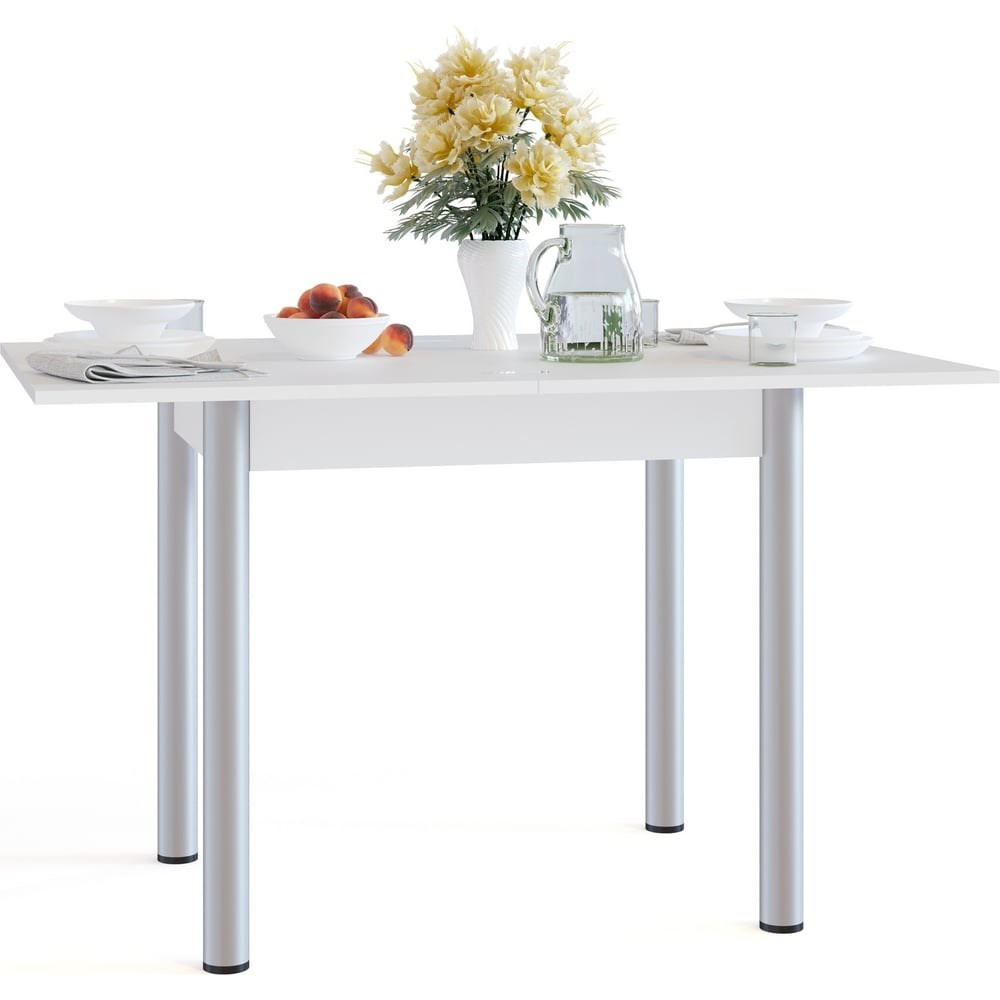 Обеденный стол СОКОЛ белый СО-1м СО1мБ6 с компактными размерами идеально пойдет для маленькой кухни. В сложенном виде размеры столешницы составляют всего 800х600 мм. Лаконичный стиль исполнения делает модель универсальной для любого интерьера. Столешница и подстолье изготавливаются из ЛДСП толщиной 16 мм. Края столешницы обработаны кромкой ПВХ 2 мм, остальные детали — ПВХ 0,4 мм. Ножки — металлические. Высота от пола до края подстолья — 620 мм. Стол оснащен поворотным раскладным механизмом, который увеличивает ширину столешницы до 1200 мм. Чтобы разложить стол, нужно отодвинуть столешницу, повернув ее на 90 градусов и раскрыть как книжку. Удобно и просто. Обратите внимание! В разложенном состоянии петли находятся на поверхности столешницы.