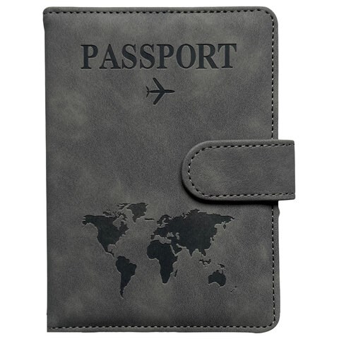 Модель выполнена из экокожи серо-голубого цвета c приятной "soft touch" поверхностью и украшена тиснением в виде надписи "Passport", фигуры самолета и карты мира.