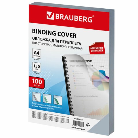 Обложки пластиковые для переплета, А4, КОМПЛЕКТ 100 шт., 150 мкм, матово-прозрачные, BRAUBERG, 532160