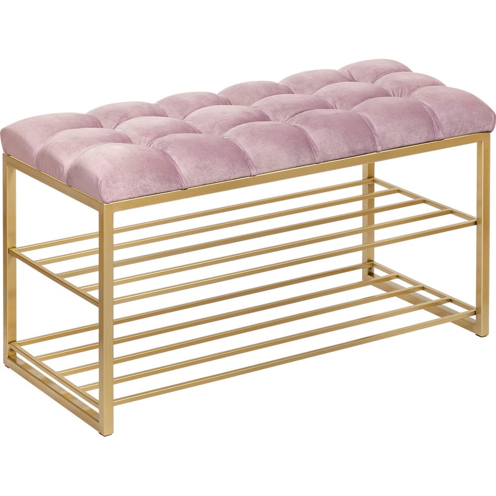 Обувница GARDA с золотым основанием и велюровой подушкой с каретной стяжкой. Стильная банкетка подойдет для прихожей, спальни, гостиной и кабинета. Обувница с сиденьем в прихожую не займет много места, но будет максимально функциональной благодаря двум полкам и скамье, обитой велюром. Основание обувницы изготовлено из стали с полимерным покрытием. Стальной каркас изготовлен из профильной трубы 20х20. Собственное производство обеспечивает надежность и эстетику сварных швов металлической мебели. Банкетка с велюровой подушкой отличается элегантным видом и комфортной посадкой. Мягкая обивка с высокой износостойкостью, прошла тест Мартиндейла — 35 000 циклов. Бархатистая ткань легко чистится от загрязнений, для ухода разрешена сухая и влажная чистка. Металлический каркас выдерживает суммарный вес до 160 кг, а порошковая окраска на собственном производстве гарантирует долговечное использование и устойчивость к внешним повреждениям. Стильная банкетка-пуф без спинки с мягким сидением и полкой для обуви подойдет для прихожей, спальни, гостиной, кухни и кабинета. Отлично будет смотреться в качестве прикроватной банкетки для дома. Можно разместить в офисе, зале, салоне, фотостудии, гостинице, баре, клубе, кафе и ресторане. Банкетка отлично сочетается со стеллажами KARIN и пуфами OMEGA. Банкетку-обувницу доставляем в собранном виде в надежной упаковке.