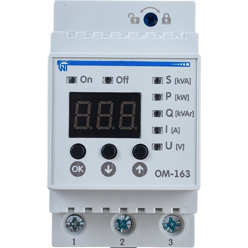 Дополнительные технические характеристики: Предназначен для ограничения потребляемой мощности, а так же для (отключения) подключенного к нему оборудования в случаях: превышения значения порога контролируемого параметра, отклонения напряжения сети от установленных значений, превышения температуры контактной группы (85°С). Реле может использоваться как реле ограничения потребляемой мощности, реле напряжения или цифровой мультиметр (индикация полной, активной, реактивной мощности, потребляемого тока и напряжения сети). Питание осуществляется от цепи, которая питает нагрузку. Ограничитель может отключать нагрузку при превышении значения одного из заданных параметров, таких как полная мощность, активная мощность, реактивная мощность, действующий ток, максимальное и минимальное напряжение. Так же существует возможность установить время отключения нагрузки, при превышении установленного порога отслеживаемого параметра, и время автоматического повторного включения (АПВ). На корпусе ОМ-163 расположен семисегментный трехразрядный дисплей, который отображает действующее значение параметров, для изменения типа отображаемых параметров необходимо воспользоваться клавишами навигации по меню, при этом будет загораться светодиод соответствующий выбранному типу параметра (полная, активная, реактивная мощность, ток, напряжение). Для защиты от изменений настроек на корпусе расположен винтовой механизм блокировки, а для защиты от изменения настраиваемых параметров прибор защищен паролем.
