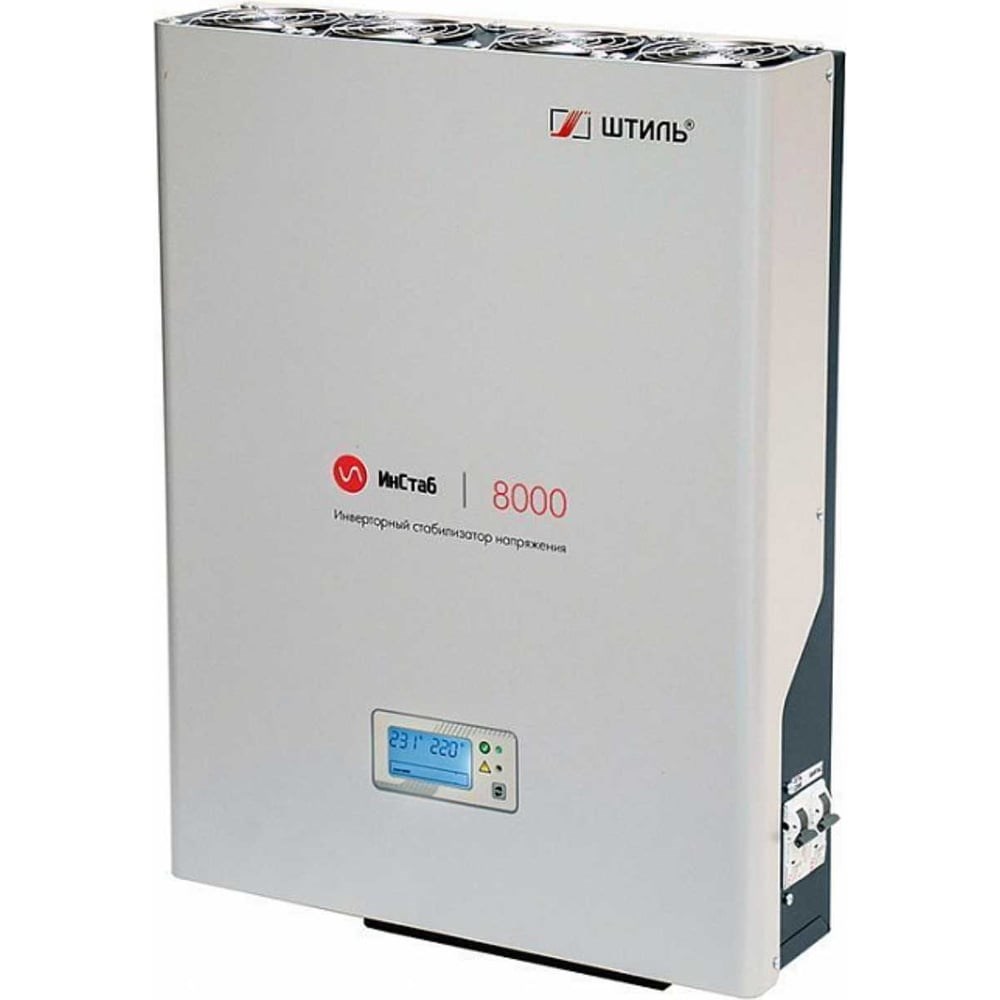 Однофазный стабилизатор переменного напряжения Штиль ИнСтаб IS8000 оснащен комбинированной системой охлаждения. При достижении критической отметки внутренней температуры стабилизатора вентиляторы автоматически начинают работу. Модель отличается низким уровнем шума во время работы вентиляторов. Корпус оснащен дисплеем с помощью которого пользователь может настраивать значение выходного напряжения в диапазоне от 220 до 230 В.