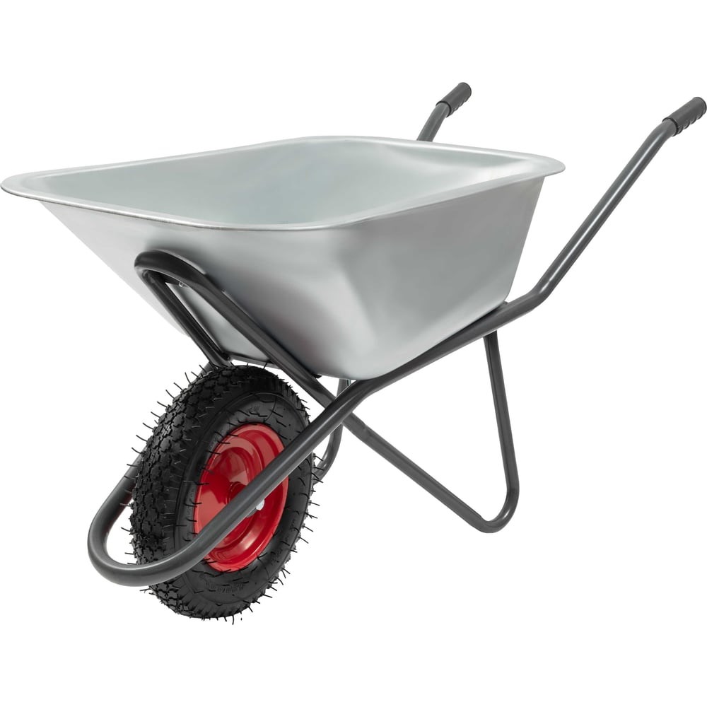 Одноколесная тачка Gigant с оцинкованным кузовом 110л, 200 кг ZAW-01 имеет пневматическое колесо и обеспечивают хорошую проходимость, снижает риск опрокидывания. Предусмотрены резиновые накладки на ручки тачки.