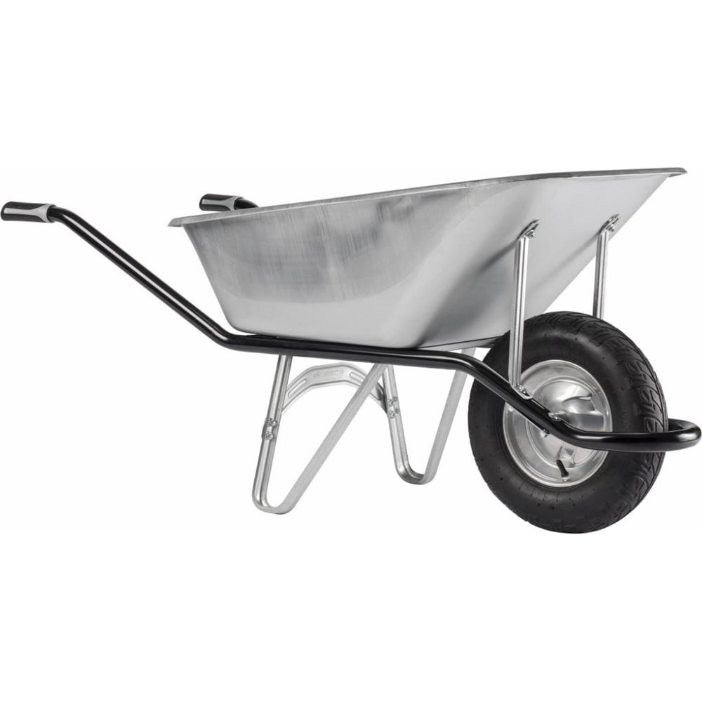 Тачка одноколесная Haemmerlin Cargo Excellium Renovation MG GF (108G) 120 л оцинкованный кузов, пневмо колесо-подшипник 301227401Одноколесные тачки Haemmerlin Cargo хорошо зарекомендовали себя в домашнем хозяйстве и на приусадебном участке, находят применения на стройках и при ведении сельхозработ. Они приспособлены для перевозки сухих, твердых и жидких грузов.Одноколесные тачки Haemmerlin Cargo являются универсальными. Конструкция рассчитана на долговечную и безопасную эксплуатацию. Сварная опорная конструкция повторяет форму дна и передней части корыта, чтобы обеспечить достаточную прочность тачки в процессе эксплуатации. При этом тачка отличается легкостью в управлении и маневренностью. Также сочетание характеристик позволяет предотвращать чрезмерные нагрузки на работника:форма рамы спроектирована для перераспределения 2/3 веса груза на мощное и надежное колесо;благодаря конструкции с подкосом упрощается разгрузка тачки;расстояние между ножками тачки рассчитано чтобы не препятствовать ходьбе;завальцованные края бортов корыта сводят на нет деформацию при ударе и минимизируют угрозу трещин;использование трапециевидной конструкции корыта в сочетании с плоским квадратным дном позволяет при загрузке переносить центр тяжести на колесо тачки, уменьшая нагрузку на ручки, и, соответственно, на работника.
