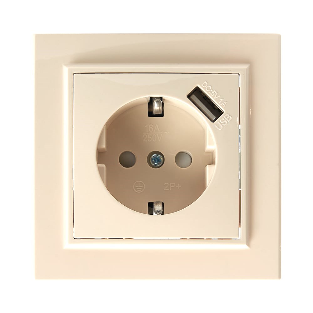 1-местная розетка STEKKER с заземлением 220В 16А с защитными шторками USB серия Эрна, слоновая кость PST16-901-02 39237