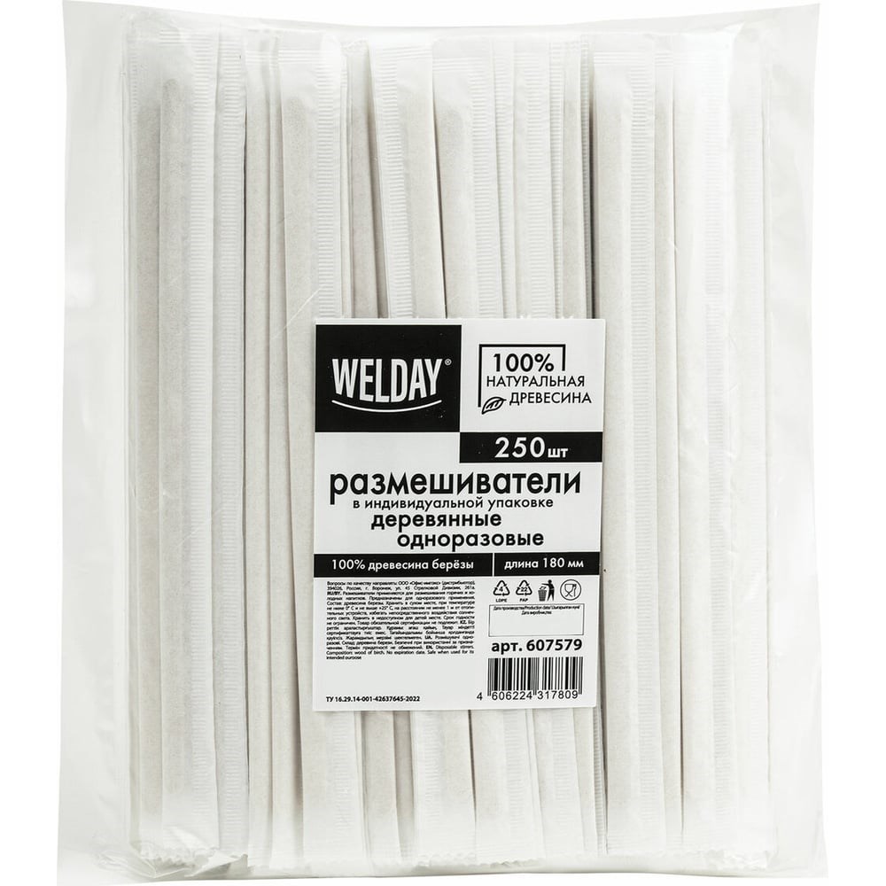 Одноразовые размешиватели WELDAY в индивидуальной бумажной упаковке используются в офисе, на предприятиях общественного питания, в дороге и быту.Размешиватели изготовлены из древесины березы.Характеризуются легкостью и безопасностью при использовании, так как не выделяют вредных веществ при взаимодействии с горячей жидкостью.Подойдут как для холодных, так и для горячих блюд (до +95°).Предназначены для одноразового применения, легко утилизируются.Длина - 180 мм.В комплекте 250 штук в индивидуальной бумажной упаковке.