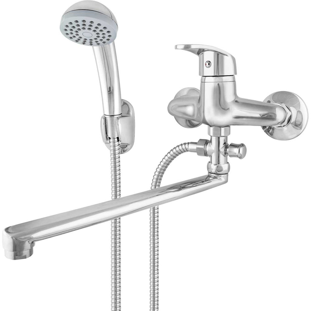 Смеситель для ванны предназначен для установки в ванные комнаты. Корпус смесителя из цинкового сплава. Цельнолитая пластмассовая ручка. Керамический картридж 40 мм с гайкой из нержавеющей стали. Крепеж стальной с прокладкой. Латунный штоковый дивертор (переключатель). Ручка переключателя из пластика. L-излив 300 мм из нержавеющей стали с пластмассовым аэратором. Эксцентрики и декоративные розетки из нержавеющей стали. Держатель для душа из высокопрочного ABS пластика. Душевой шланг 1,5 м верхняя оплетка шланга - нержавеющая сталь, силиконовые прокладки. Подводка в комплект не входит!