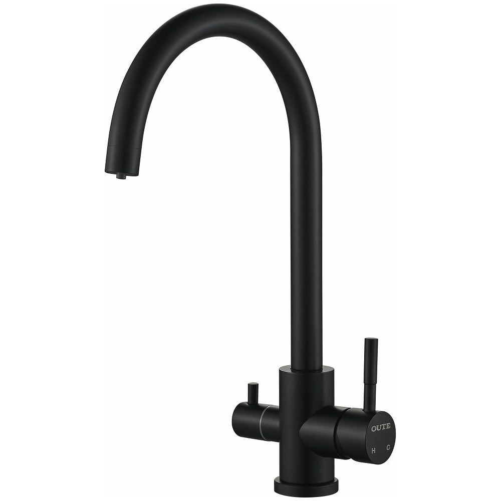 Смеситель для кухни OUTE однорычажный, черный матовый, со встроенным краном под питьевую воду, нержавеющая сталь T60203CK-300 с боковой ручкой и отдельным выходом под фильтр ,выполнен из нержавеющей стали SUS 304, которая отличается хорошими противокоррозионным свойствами, а также имеет длительный срок эксплуатации. Лаконичный и современный дизайн делают смеситель прекрасным дополнением любого интерьера.