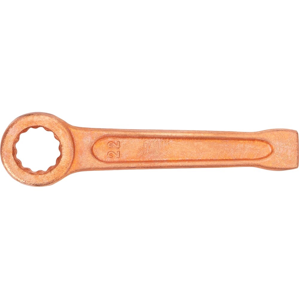 Двусторонний накидной ударный ключ предназначен для работ с резьбовыми соединениями в процессе ремонтных и монтажных работ. Инструмент выполнен из высококачественной стали, благодаря чему отличается прочностью и долговечностью. Омедненное покрытие обладает повышенной устойчивостью к высокотемпературному воздействию случайной искры. Ключ может применяться на предприятиях с наличием потенциально опасных сред, а также в быту. Одна из рабочих поверхностей ключа предназначена для ударных воздействий с целью увеличения усилия при работе с тугими крепежными соединениями.