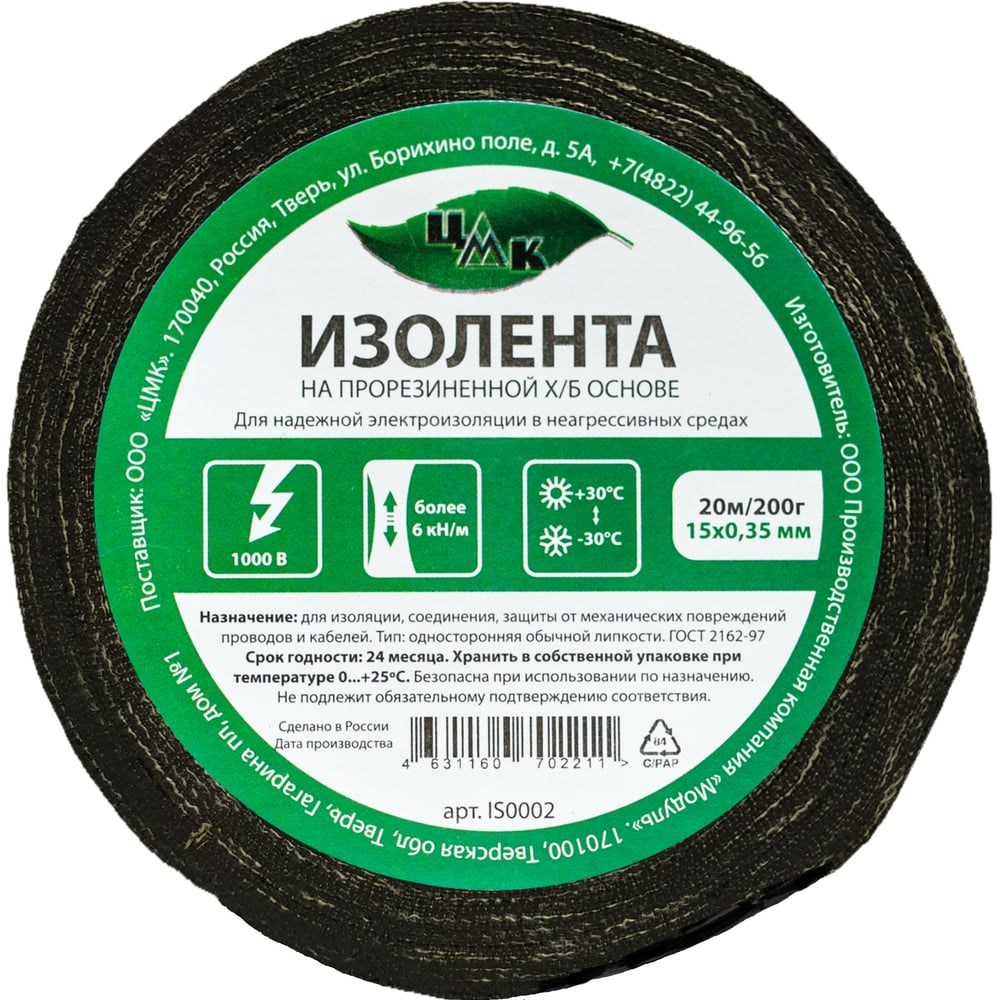 Изолента ЦМК Х/Б, 15 мм х 20 м, односторонняя, черная, 200 г IS0002 предназначена для изоляции, соединения, цветной маркировки и защиты от механических повреждений проводов и кабелей.Дополнительные технические характеристики:Материал: хлопчатобумажная лента на клеевой резиновой основе.Напряжение: до 1000ВВысокая устойчивость при растяжении.