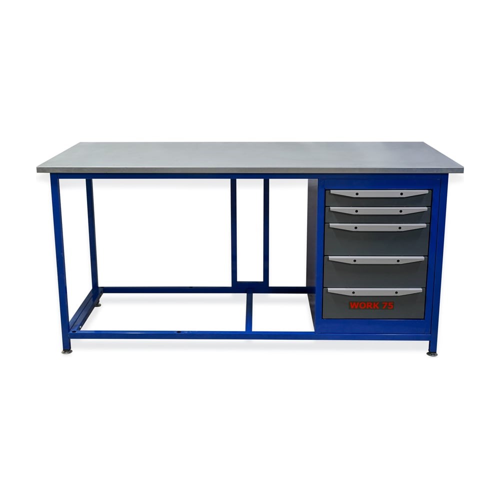 Однотумбовый верстак WORK серии WK1800(Т5) используется для рациональной организации рабочего места при проведении различных сборочных и ремонтных операций. Верстак поставляется в разобранном виде, за исключением тумб, которые поставляются полностью собранными. Каркас верстака состоит из двух опор, верхней и нижней рам, а также рамки жесткости, изготовленных из стальной профильной трубы 30х30 мм. Каркас собирается с помощью стандартных болтов М8. Порошковое покрытие каркаса обеспечивает защиту от коррозии и долгий срок службы. Тумбы верстака комплектуются пятью выдвижными ящиками двух типоразмеров по высоте. Ящики фиксируются механизмом центрального замка и могут запираться на навесной замок. Выдвижение ящиков осуществляется с помощью телескопических шариковых направляющих (типа развернутый подшипник) с креплением на зацепах. Вариант крепления направляющих на зацепах позволяет избежать наличия выступающих частей заклепок на внутренних поверхностях выдвижных ящиков, что важно при использовании покупных ложементов для укладки инструмента в ящике. Максимальная распределенная нагрузка на ящик 45 кг. В стенках тумб установлены жесткие упоры, предотвращающие выпадение нагруженных ящиков при резком выдвижении ящика в крайнее положение «на себя». Столешница изготовлена из фанеры 24 мм и закрыта стальным оцинкованным листом стали толщиной 1,2 мм. Максимальная распределенная нагрузка на столешницу до 350 кг.