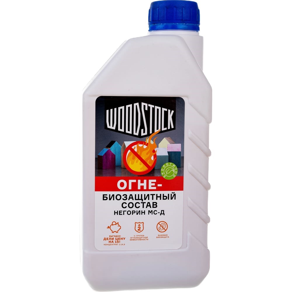 Огнебиозащита Woodstock НЕГОРИН-МС-Д концентрат 1:14,5 1 кг (15,5 кг готового состава) ТД000003767 применяется внутри сухих помещений. Продукт защищает деревянные конструкции от биологического воздействия (грибок, плесень), а также снижает их пожароопасность (2 группа). Экологичный состав абсолютно безопасен для здоровья человека.