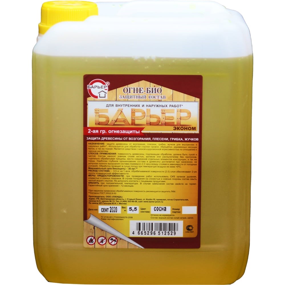 Огнебиозащитный состав для древесины БАРЬЕР ЭКОНОМ сосна желтый, канистра 5,5 кг 4665296512529 препятствует возгоранию и поражению грибами (плесневыми, окрашивающими, дереворазрушающими), водорослями и жуками-древоточцами деревянных поверхностей. Средство обеспечивает 2-ю (типовую) группу огнезащитной эффективности. Состав придает древесине золотисто-желтый оттенок «сосна» и сохраняет её естественную паропроницаемость.