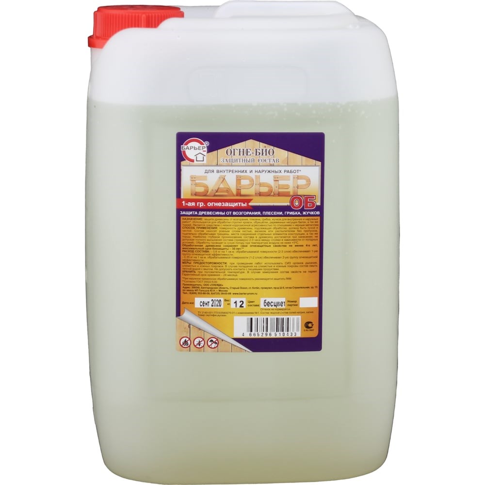 Огнебиозащитный состав для древесины БАРЬЕР ОБ бесцветный, канистра 12 кг 4665296510433 служит для комплексной защиты деревянных поверхностей от возгорания и поражения плесневыми, окрашивающими, дереворазрушающими грибами, водорослями и жуками-древоточцами. Продукт обеспечивает 1-ю (высшую) группу огнезащитной эффективности. Срок действия огнезащитных свойств - от 4 до 30 лет в зависимости от условий эксплуатации.