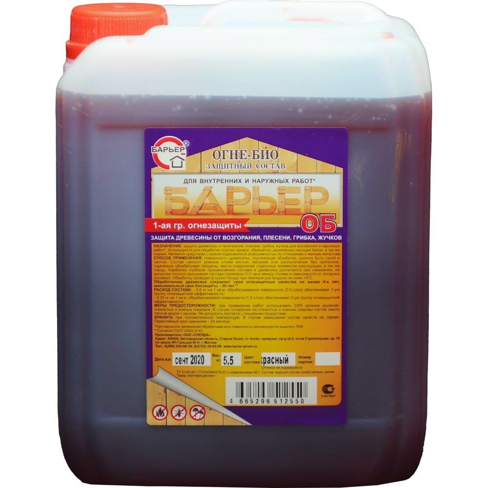 Огнебиозащитный состав для древесины БАРЬЕР ОБ красный, канистра 5,5 кг 4665296512550 предотвращает возгорание древесины и ее поражение грибами (плесневыми, окрашивающими, дереворазрушающими), водорослями и жуками-древоточцами. «БАРЬЕР-ОБ» обеспечивает 1-ю (высшую) группу огнезащитной эффективности. Продукт тонирует поверхность древесины в красный цвет, помогает сохранить прочность и естественную паропроницаемость материала.