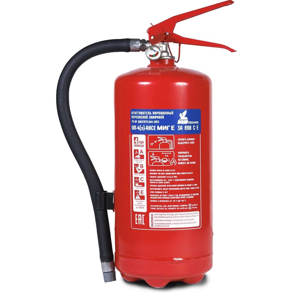 Профессиональный огнетушитель ОП-4 МИГ Е (3А 89В, С, Е) 111-22 ОП-4 МИГ Е: Надежная защита с уникальными конструктивными особенностями Профессиональный огнетушитель ОП-4 МИГ Е (3А 89В, С, Е) 111-22 — это высокоэффективное средство пожаротушения с закачкой осушенным азотом. Этот огнетушитель обладает повышенной огнетушащей способностью и конструктивными особенностями, которые не имеют аналогов на рынке. Конструктивные особенности: Антикоррозионная защита: Корпус баллона имеет дополнительные защитные покрытия, что соответствует климатическому исполнению ОМ2 с уровнем защиты по ISO 12944-5 - C4-H, обеспечивая долговечность и стойкость к коррозии. Клапан сброса избыточного давления: Позволяет безопасно использовать огнетушитель на специализированных производствах и разработках, предотвращая риск избыточного давления в баллоне. Назначение: Широкое применение: Подходит для размещения в административных, складских, торговых, жилых и промышленных зданиях. Соответствие стандартам: Полностью соответствует требованиям ГОСТ Р и выступает как высококачественный аналог европейских профессиональных огнетушителей. Огнетушащая способность: Класс А: 3А — эффективен для тушения до 12 м² твердых горючих материалов. Класс В: 89В — способен потушить до 70 литров горящего бензина. Классы С и Е: Подходит для тушения газообразных веществ и электроустановок под напряжением до 1000 В.