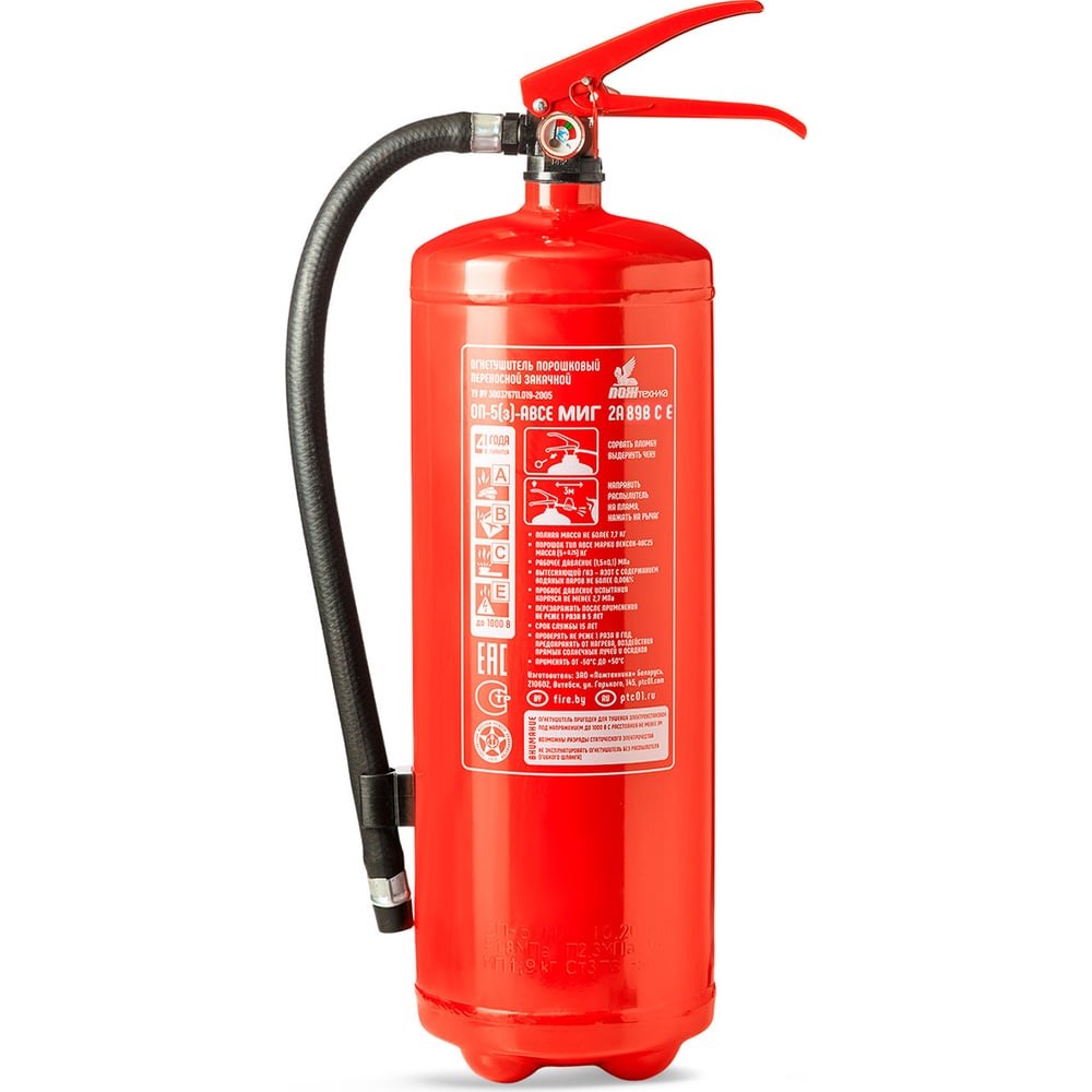 Огнетушитель МИГ ОП-5/з АВСЕ (2А 89В С Е) 111-07 — это надежное средство пожаротушения с повышенной огнетушащей способностью. Закачен осушенным азотом, срок службы 15 лет, с уровнем защиты от коррозии С2 по ISO 12944-5 и климатическим исполнением О2 по ГОСТ 15150. Оснащен удобным держателем распылителя на баллоне. Использование: Проверка: Убедитесь в исправности огнетушителя. Активизация: Приведите огнетушитель в действие. Тушение: Направьте струю на источник возгорания. Назначение: Защита помещений для бизнеса: для помещений категорий Г, Д, общественных зданий согласно ППР РФ Приложение 1, а также при проведении огневых работ (Гл.XVI). Защита транспортных средств: для автобусов, троллейбусов, грузовых автомобилей и их шасси (категории М2, М3, N по ТР ТС 018/2011) согласно п.7.7 ПДД РФ, для железнодорожного подвижного состава согласно ППР РФ Приложение 3, а также для морских судов согласно Правил классификации и постройки морских судов (ч.6). Защита дома и дачи: для нежилых помещений (баня, гараж, кладовая, мастерская, котельная) согласно рекомендаций завода. Огнетушащая способность (ранг): по классу А: 2А (обеспечивает тушение 9,6 м2 твердых горючих материалов). по классу В: 89В (обеспечивает тушение 59л горящего бензина), в 1.25 раза выше, чем по нормативу (70В). по классу С: есть (по нормативу не имеет измеримого показателя). по классу Е: есть (обеспечивает тушение электроустановок под напряжением до 1000 В).