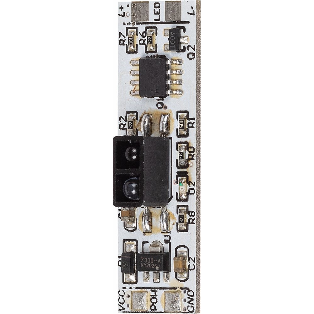 Выключатель бесконтактный ИК "открытие/закрытие двери" 12В, 24Вт, 2А, IP20, 30х12х8мм, ML-DS устанавливается внутри ящика или шкафа. При закрывании двери ИК луч отражается от двери и выключает подсветку. При открывании двери происходит включение подсветки. Радиус действия датчика составляет 10 см. Применяется только с одноцветной светодиодной лентой, светодиодными модулями, пикселями и другими источниками света напряжением DC 12 В.Производите установку, предварительно выключив электричество согласно обозначениям маркировок выводов/площадок под пайку на печатной плате датчика (не имеет функции защиты от неправильного подключения).Перед применением обязательное приклеивание изделия на двухсторонний скотч.