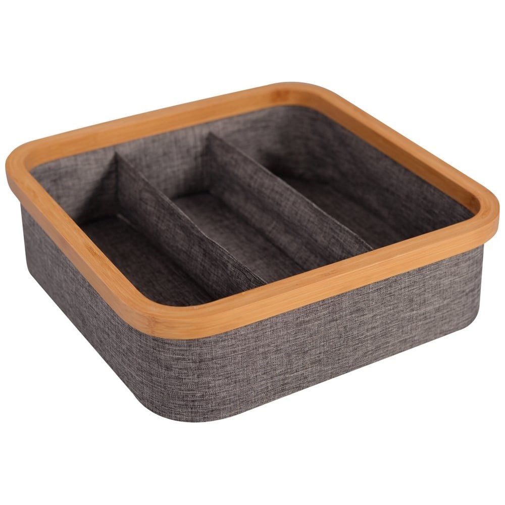 Органайзер для хранения вещей МУЛЬТИДОМ предназначен для хранения малогабаритных вещей, таких как чулочно-носочные изделия, нижнее белье, изделия для рукоделия, кухонные принадлежности, косметика, ремни, а также других предметов домашнего обихода и аксессуаров. Органайзер поможет организовать пространство. Положите его в выдвижной ящик шкафа, комода, тумбы или поставьте на полку или стол и нужные предметы всегда будут под рукой. Наличие трех отделений позволит содержать нужные мелочи в порядке. Рекомендации по уходу: текстиль чистить сухой, мягкой щеточкой или щеткой-роликом с липким слоем. При сильном загрязнении можно почистить влажной губкой и протереть сухой салфеткой, хорошо впитывающей влагу. Деревянную часть протереть влажной, затем сухой салфеткой.