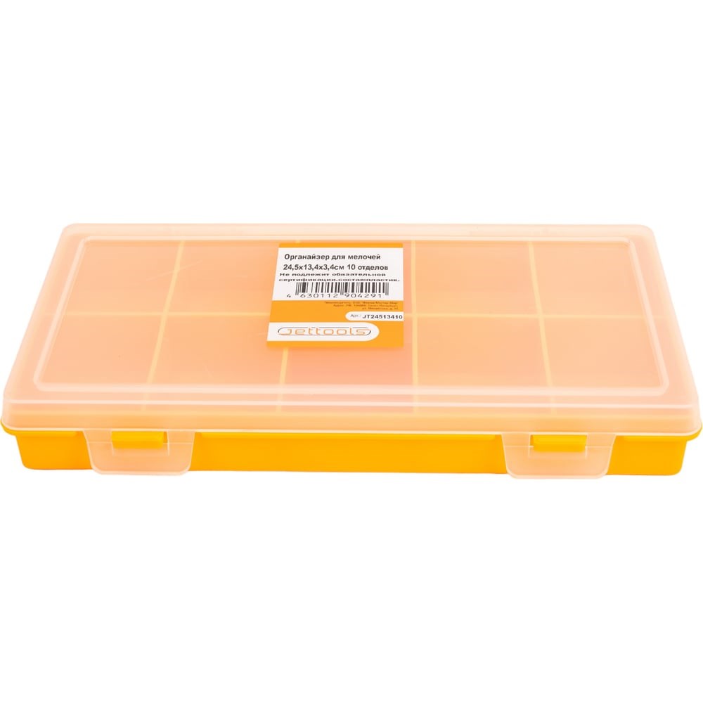 Органайзер для крепежа JETTOOLS 240x130x35 мм 10 отделений JT24513410 предназначен для хранения и переноски мелких крепежей, для грамотной организации рабочего места. Изготовлен из высококачественной пластмассы. Материал не содержит в составе вредных для здоровья веществ, а потому безопасен для здоровья. Прозрачная крышка позволяет увидеть содержимое органайзера. Внимание! Товар поставляется в ассортименте цветов без возможности выбора!