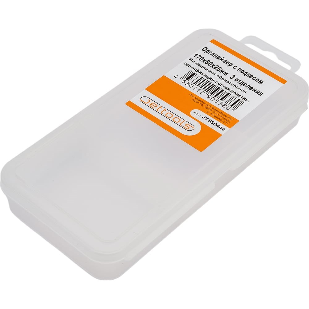 Органайзер с подвесом JETTOOLS 170x80x25 мм, 3 отделения JT550444 предназначен для хранения и переноски мелких крепежей, метизов и аксессуаров. Изделие выполнено из высококачественной пластмассы, благодаря чему отличается прочностью и долговечностью. Материал не содержит в составе вредных для здоровья веществ, а потому безопасен для здоровья. Прозрачная крышка позволяет увидеть содержимое органайзера. Наличие подвеса позволяет удобно хранить органайзер.
