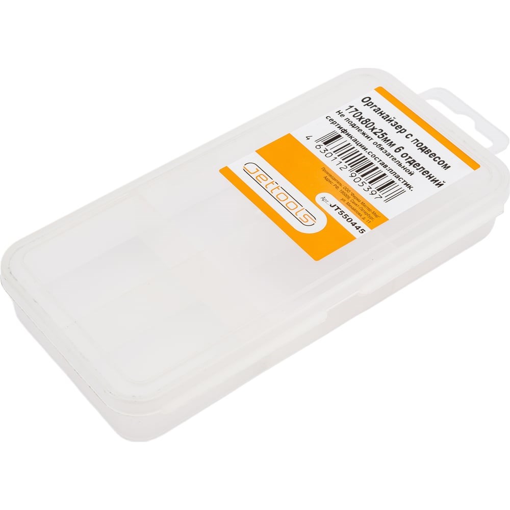 Органайзер с подвесом JETTOOLS 170x80x25 мм, 6 отделений JT550445 предназначен для хранения и переноски мелких крепежей, метизов и аксессуаров. Изделие выполнено из высококачественной пластмассы, благодаря чему отличается прочностью и долговечностью. Материал не содержит в составе вредных для здоровья веществ, а потому безопасен для здоровья. Прозрачная крышка позволяет увидеть содержимое органайзера. Наличие подвеса позволяет удобно хранить органайзер.