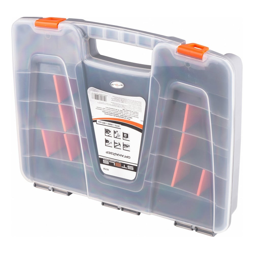 Органайзер из пластика Stels 90708 размером 370 х 280 х 60 мм позволяет обустроить практичное место хранения мелких деталей. Также его удобно брать с собой на выездные работы. Органайзер помогает поддерживать порядок в мастерской и предотвращает потерю деталей.
