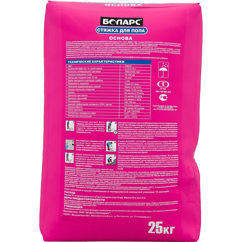 Основа-стяжка для пола БОЛАРС 25 кг 00000014814- высокопрочная стяжка БОЛАРС "ОСНОВА" предназначена для базового выравнивания поверхностей и создания уклонов, в т.ч.: 1) для устройства всех видов монолитных (контактных) стяжек; 2) укрытия трубопроводов и других коммуникаций; 3) для использования в системе "теплый пол"; 4) для создания "полусухих" стяжек; 5) для изготовления стяжек со щебнем. Толщина слоя от 10 до 150 мм (при создании стяжек со щебнем возможна толщина слоя до 350 мм). Стяжка применяется под последующее нанесение самовыравнивающихся смесей и крепление напольных покрытий. Стяжка предназначена для нагрузок на поверхность до 200 кгс/см². Применяется для заливки полов ручным способом.Расход смеси зависит от рельефа основания. 18 кг/м² сухой смеси при толщине слоя 10 мм.(мешок 25 кг на 1,4 м²)