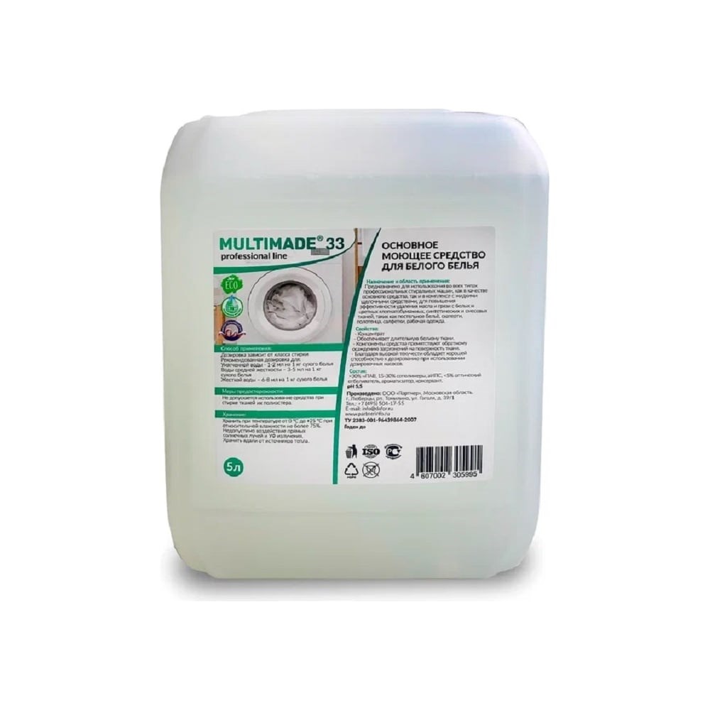 Основное моющее средство для белого белья Мультимэйд 33 предназначено для использования во всех типах профессиональных стиральных машин, как в качестве основного средства, так и в комплексе с жидкими щелочными средствами для повышения эффективности удаления масла и грязи с белых и цветных хлопчатобумажных, синтетических и смесовых тканей, таких как постельное бельё, скатерти, полотенца, салфетки, рабочая одежда.Способ примененияРекомендованная дозировка для:умягченной воды - 1-2 мл на 1 кг сухого белья;воды средней жесткости – 3-5 мл на 1 кг сухого белья;жесткой воды - 6-8 мл на 1 кг сухого белья.Не допускается использование средства при стирке тканей из полиэстераХранить вдали от источника тепла